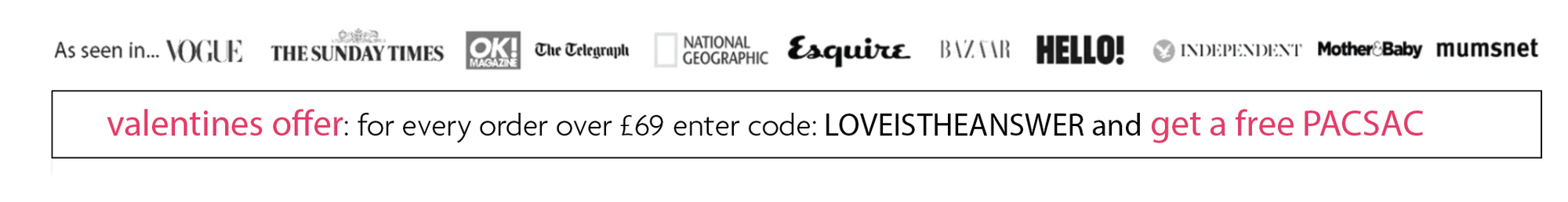 Spend over £69 and enter code: LOVEISTHEANSWER at checkout and you will receive a free PacSac with £20 with your order.